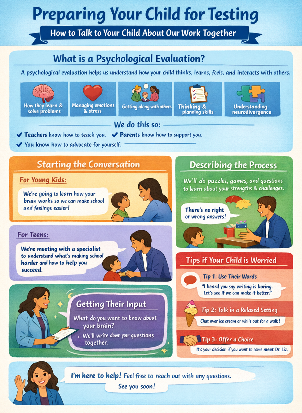 When your child comes in, they’ll participate in a variety of activities. These might include puzzles, games, answering questions, and talking about things they enjoy, things they find challenging, and how they feel. The purpose is to learn about your child’s strengths and challenges—not just at school, but also with friends, feelings, and everyday life. There are no right or wrong answers, and your child is not in trouble or sick; this is simply a way to help everyone understand them better.